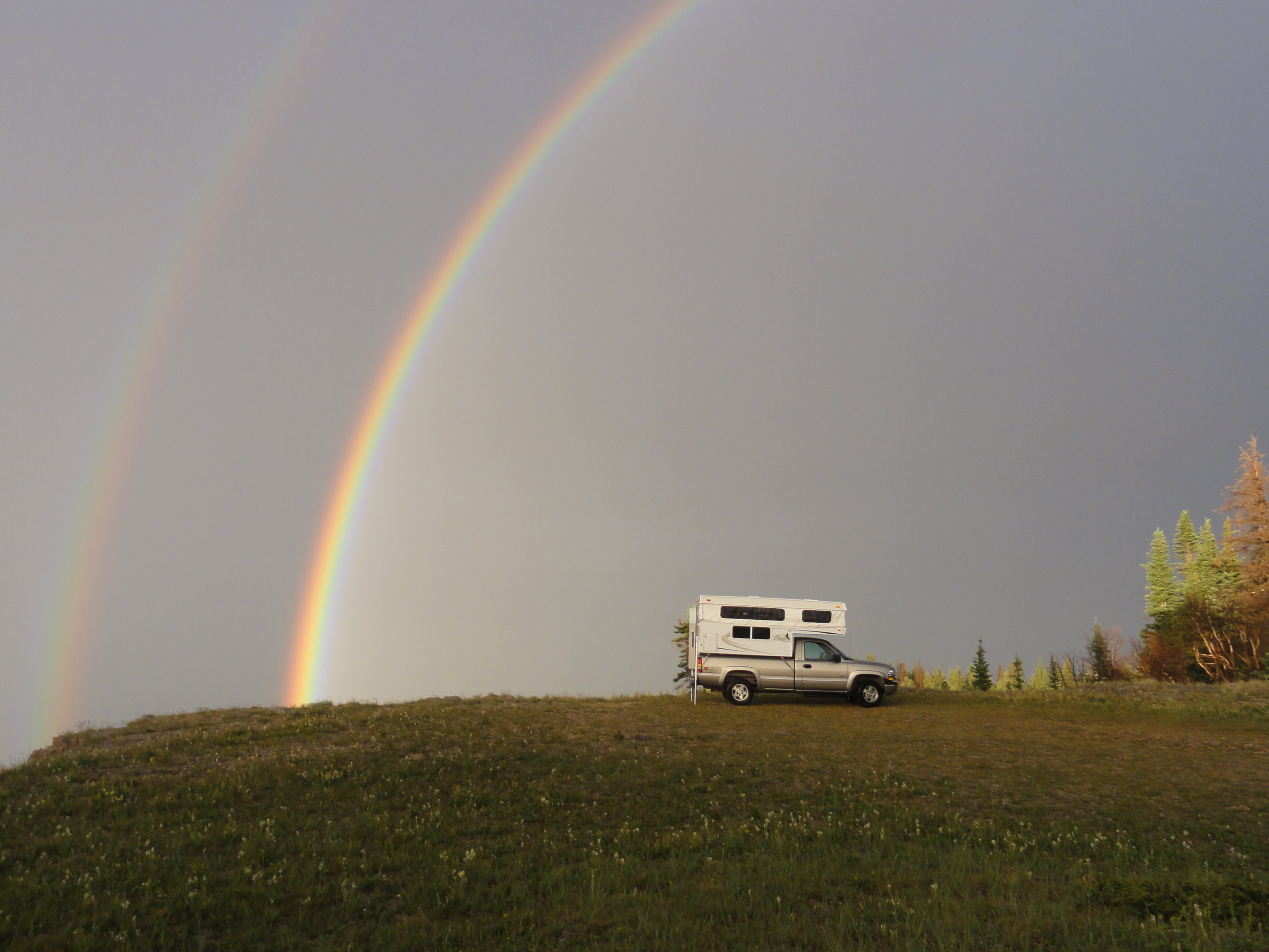 Last year we found the perfect spot looking out over the Madison River Valley. Thunderstorms rolled in during the afternoon, but the sun broke through toward evening, and a double rainbow arched over our camper: