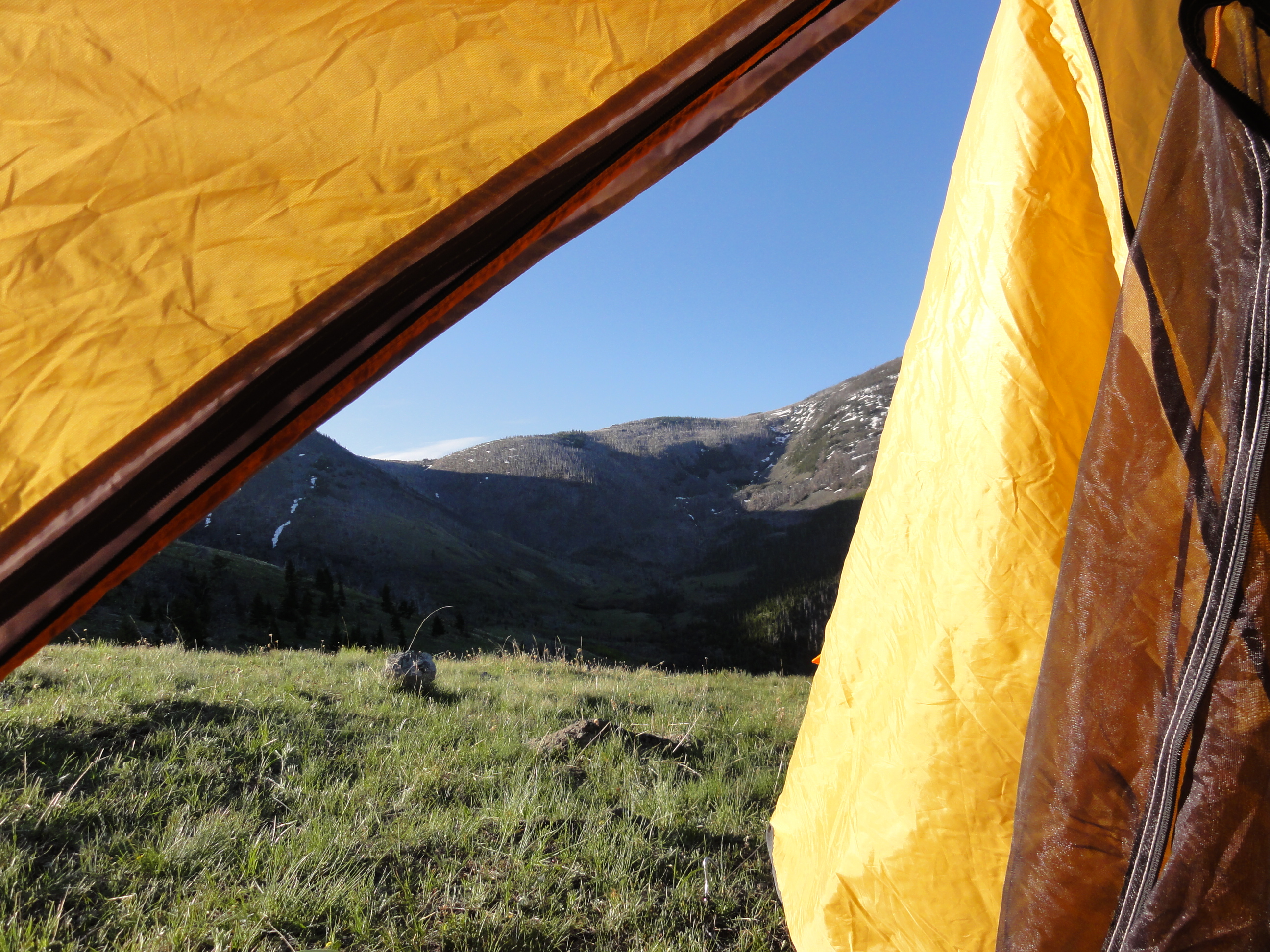 4.  A tent that is roomy enough for two people, with a good rainfly that really does keep out the rain.  I never used to think that a door on each side was important, but since we’ve had the REI Half Dome, I’ve decided that they are indeed indispensable, not least because they allow me to wake up and see the wonderful view without getting out of my sleeping bag: