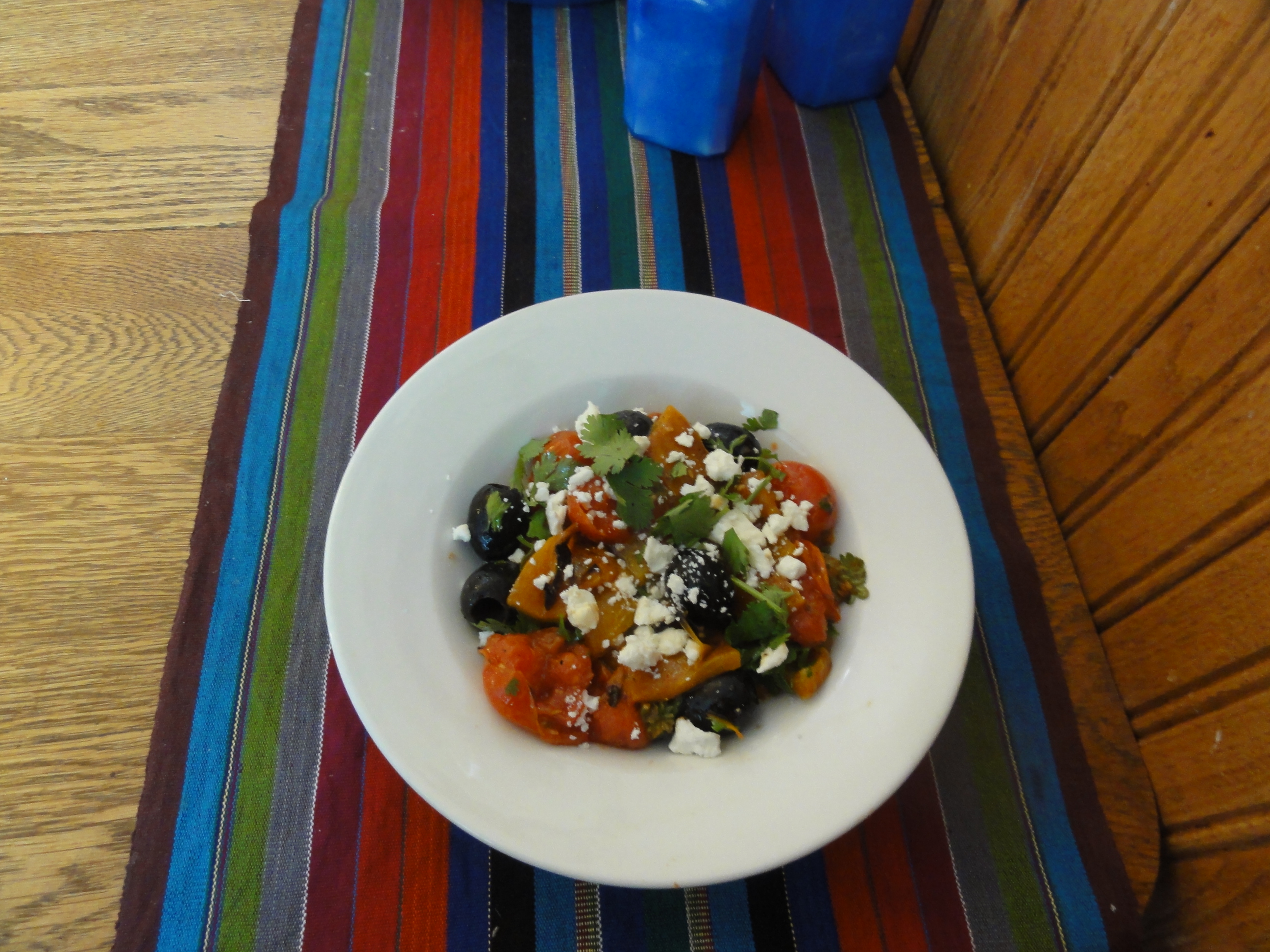 Grill the peppers and the tomatoes.   (I usually roast the peppers on the grill until they’re charred,  put them in a plastic bag to steam for 15 – 20 minutes,  and then peel them.  I put the cherry tomatoes on a couple of skewers and grill them for 5 or 10 minutes until they’re soft.)     Chop the peppers into bit size pieces, and mix with the tomatoes and the black olives.  Add the teaspoon of cumin, chopped cilantro, lemon juice, and drizzle with olive oil.    Add salt and pepper, and top with crumbled feta or goat cheese.