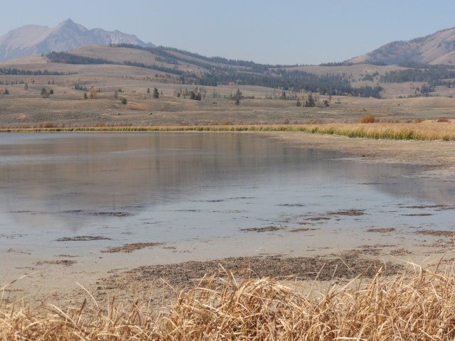 3.  Swan Flats is another grand spot to hang out and watch.   The Flats are a large meadow with a number of shallow lakes, above Mammoth Hot Springs and off the road to Norris Hot Springs.  You can either set up close to the road, or hike out the Glen Springs trail for as far as you want.     Swan Flats is frequented by trumpeter swans and other migrating water birds in the spring, and we’ve regularly seen wolves, bears, and coyotes there.  And it’s just a gorgeous spot in any season.