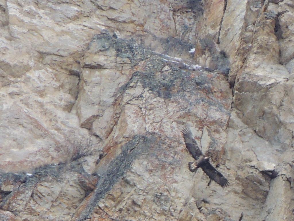 but we couldn’t find it until we could follow one of the eagles to it.   The eagle landed on the cliff face, but even with binoculars we couldn’t be sure that what appeared to be a nest wasn’t just a bush.    I took a photo anyway, and when I zoomed in, we could see that we’d actually gotten a picture of the golden eagle sitting in the nest.  How cool.