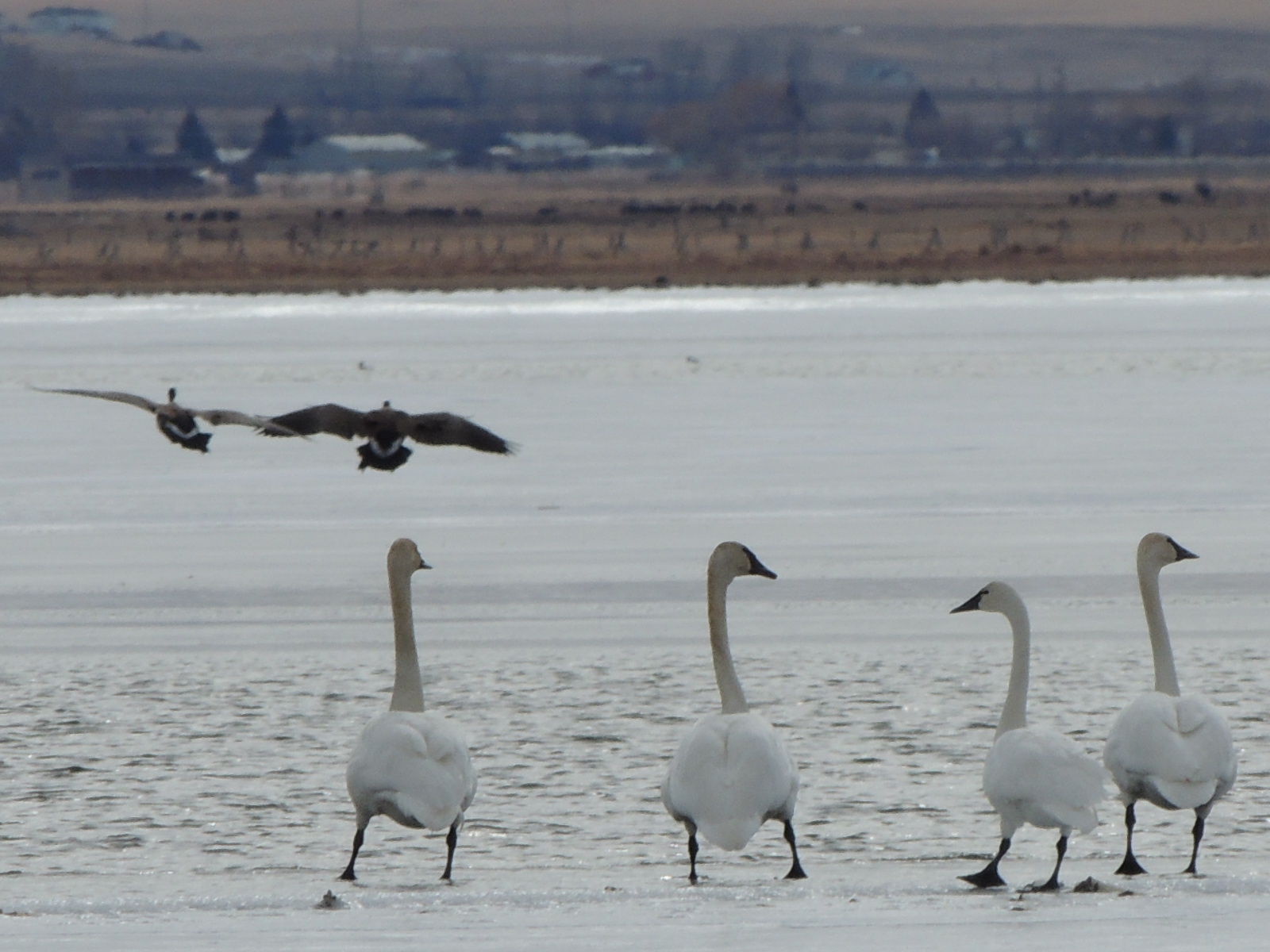 And it wasn’t just nesting eagles signalling a new season.    In a patch of ice-free water at the edge of a nearby lake, in the middle of a noisy flock of Canadian geese I discovered a small group of trumpeter swans resting on their way north.  There will be more and more in the coming weeks, along with snow geese, and soon both meadowlarks and bluebirds will return as well.    The geese panicked as I got close, but the swans just regally moved away…