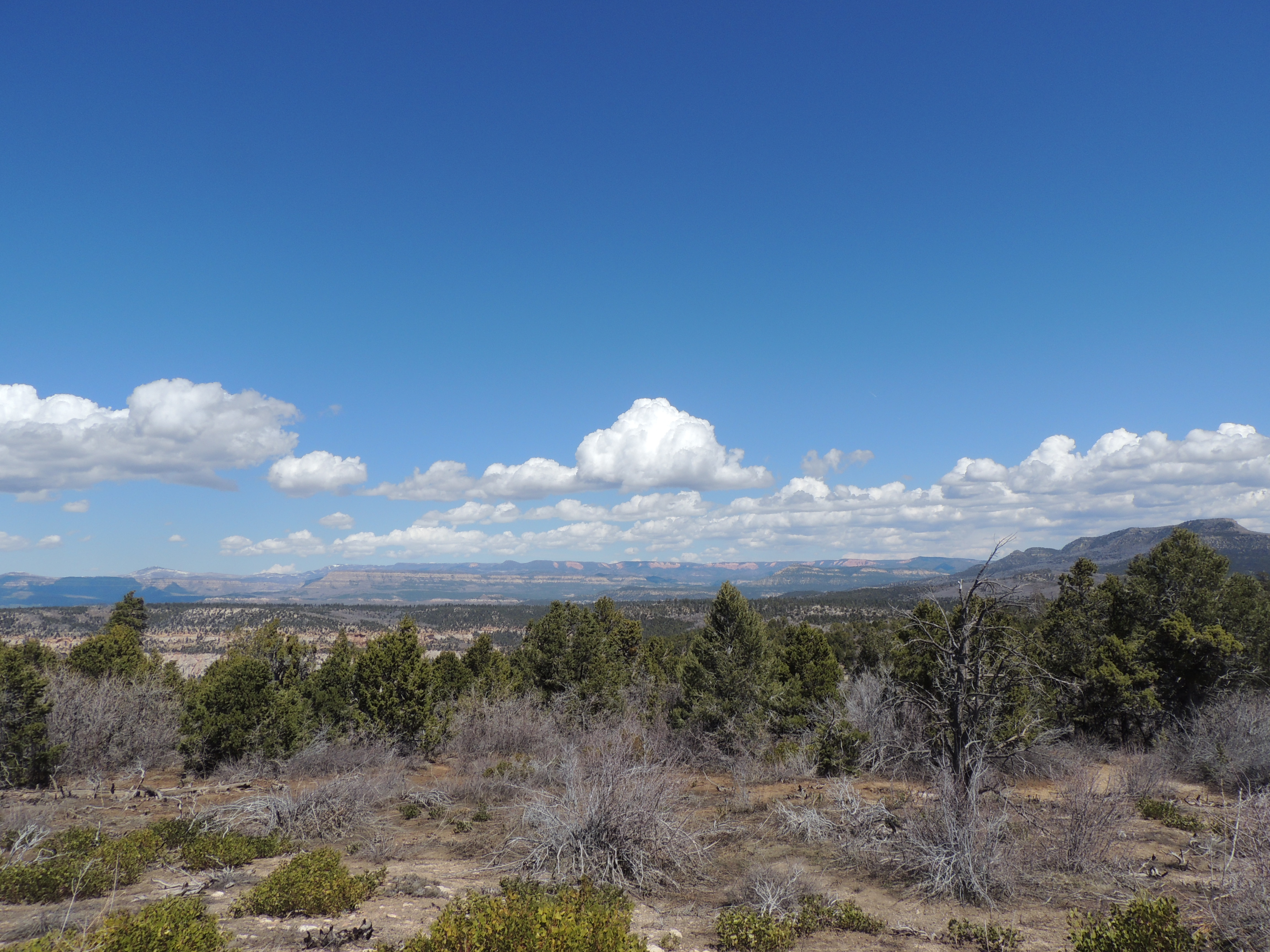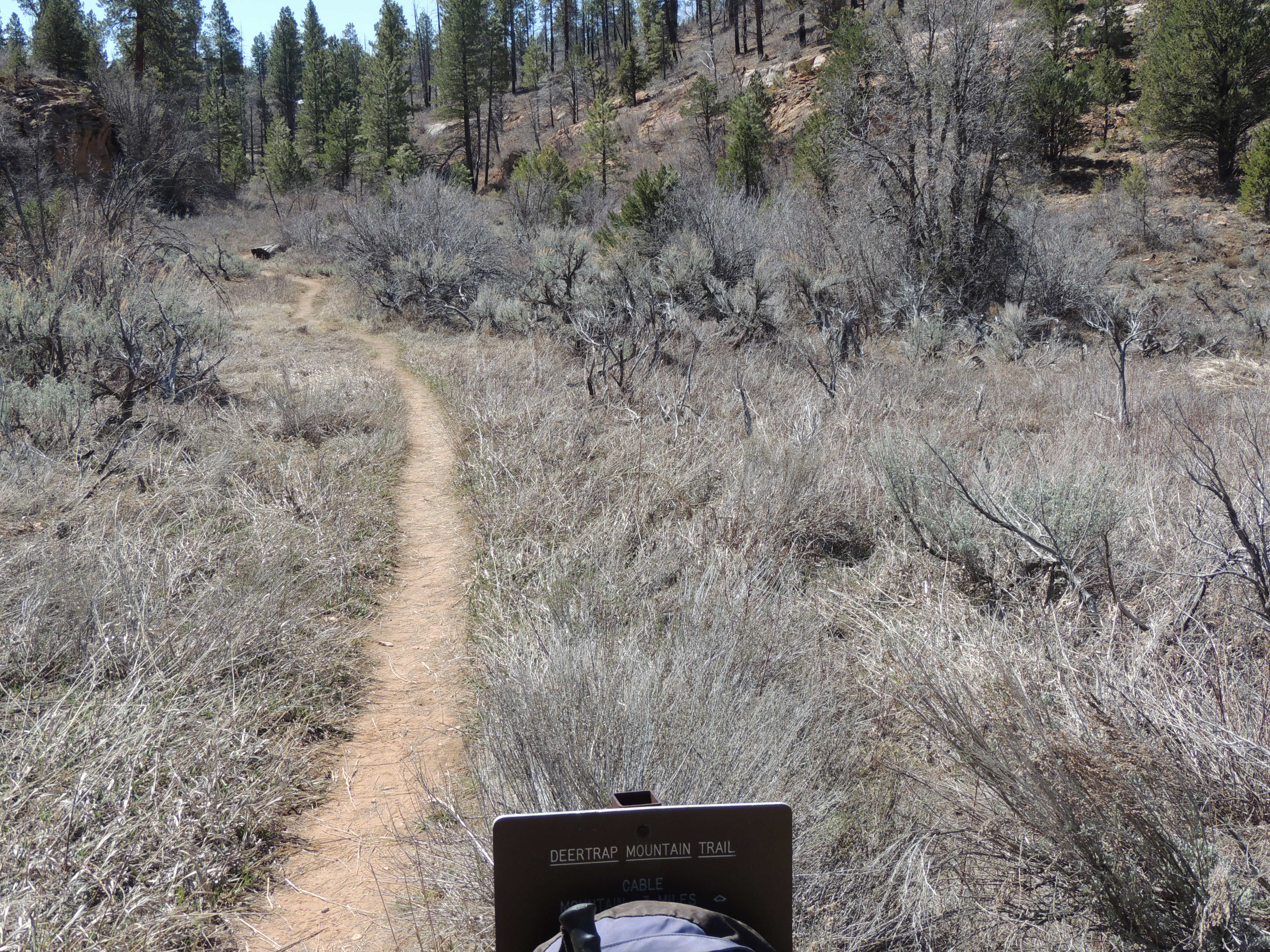 The trail crosses the mesa top, and then begins a gradual climb to Deertrap and Cable Mountains.