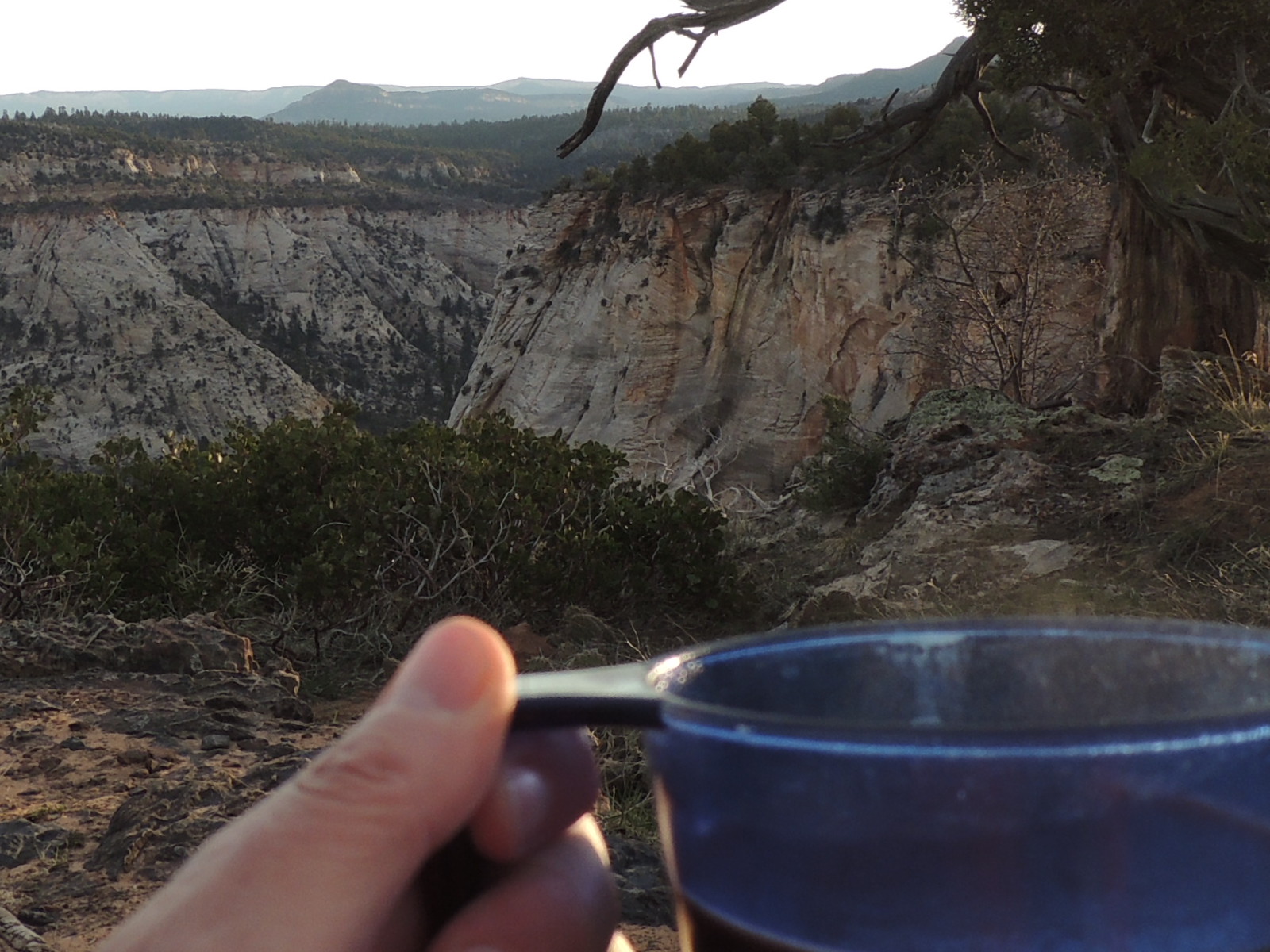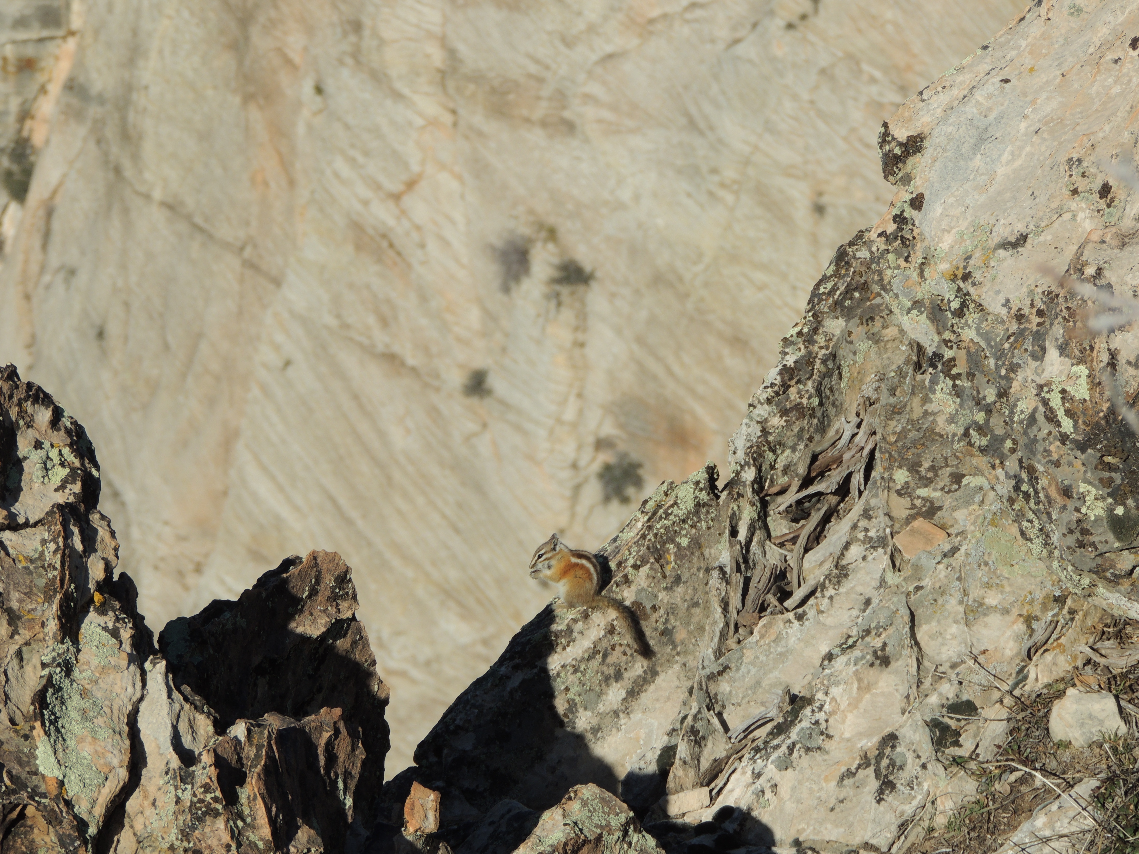 We found a campsite away from the trail, but on the edge of the canyon, and spent the afternoon watching vultures and ravens soar below us.   We were visited by western bluebirds and a fearless chipmunk, and I could even watch people hiking the switchbacks across the canyon on the trail to Observation Peak.