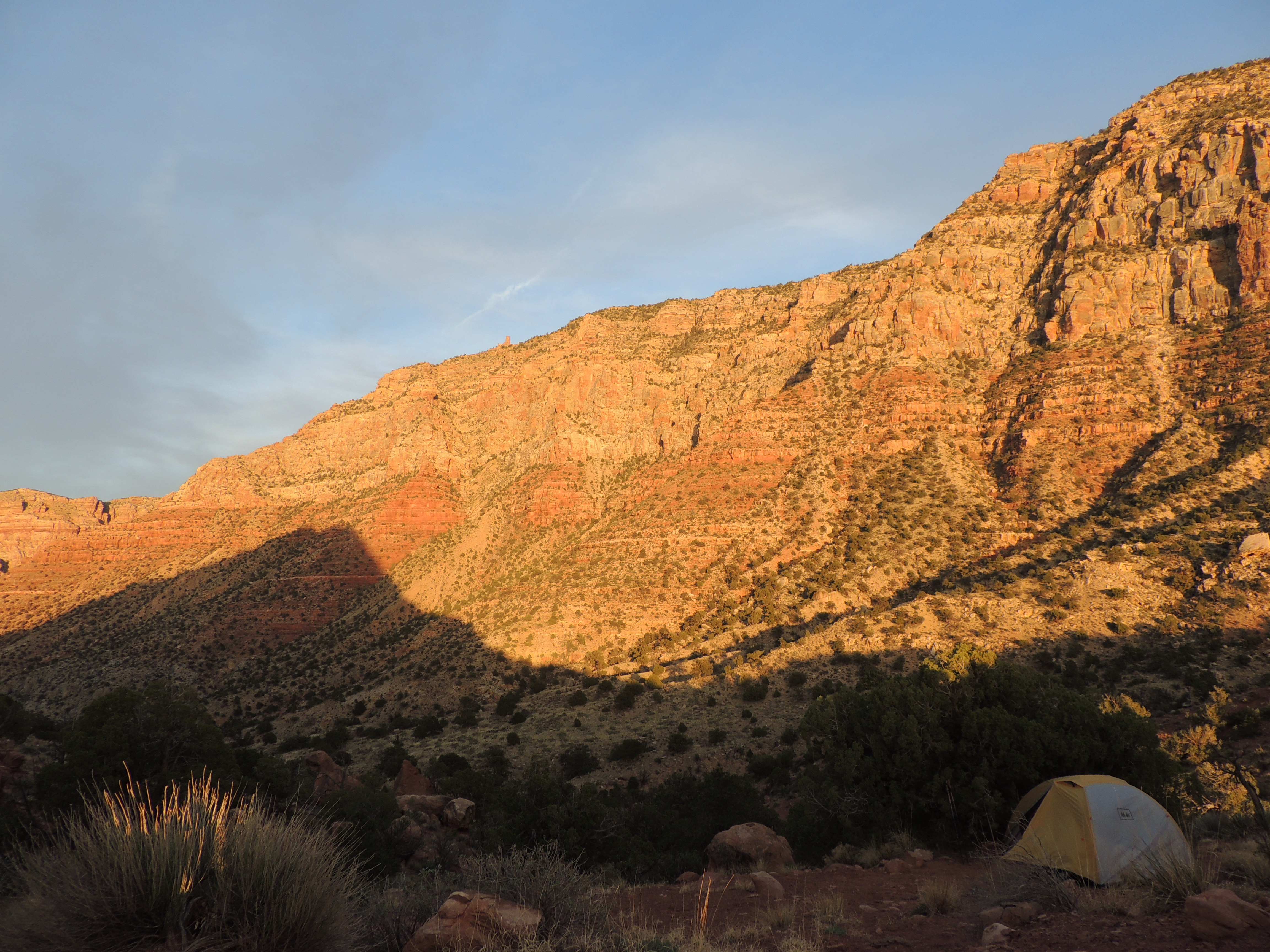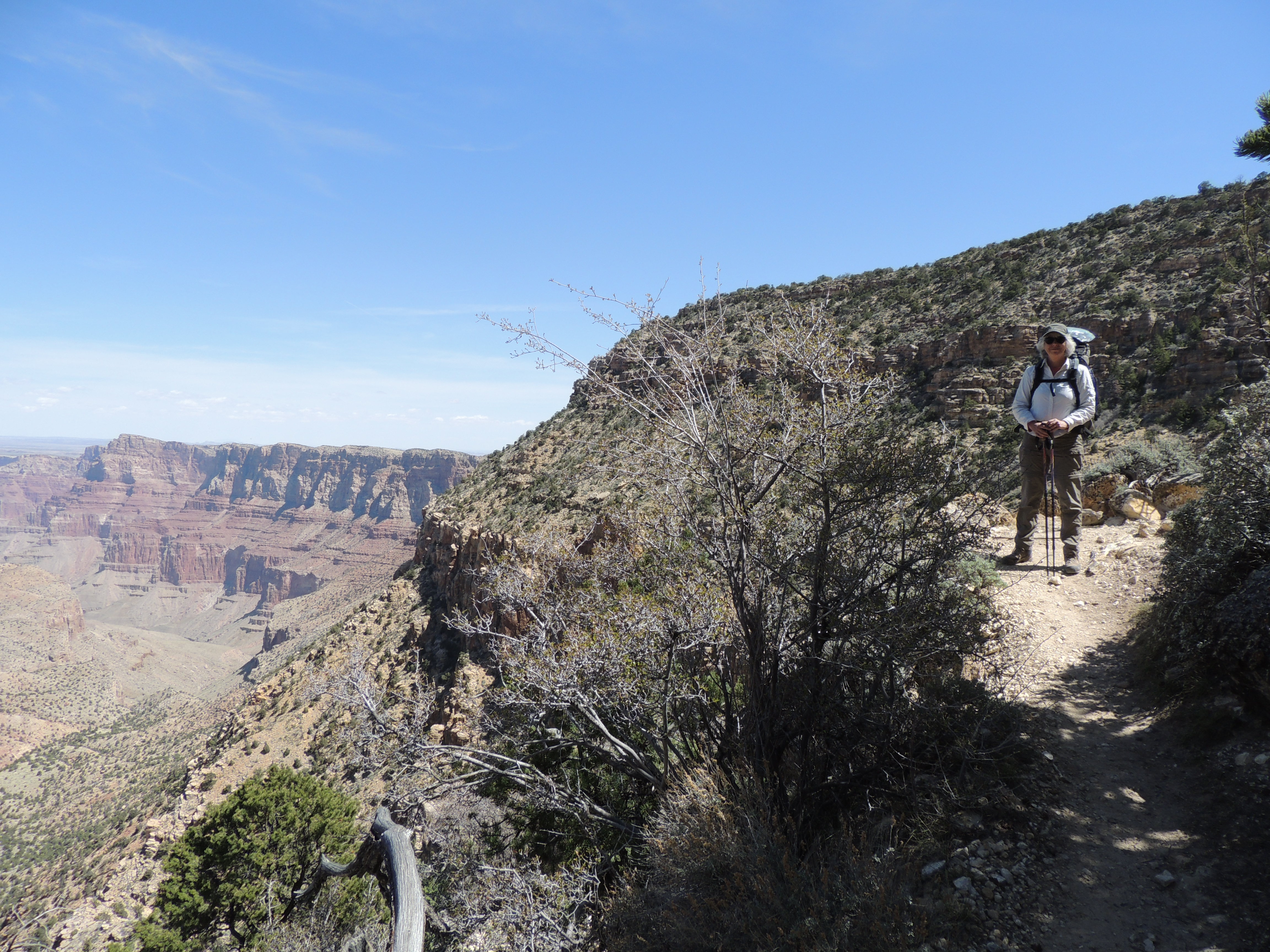 Actually, we did this one nighter in what I think was a really smart way: we hiked down a few miles, set up camp, and then hiked a bit further in the late afternoon. I was concerned about not having enough water for the hike up and out, but we were fine. (The water situation was helped by the fact that I forgot to pack the coffee, so we didn’t get to sit around camp in the morning with a hot cup of coffee. This would have been a crisis on a longer trip, but on this one it meant more water for the hike out.)