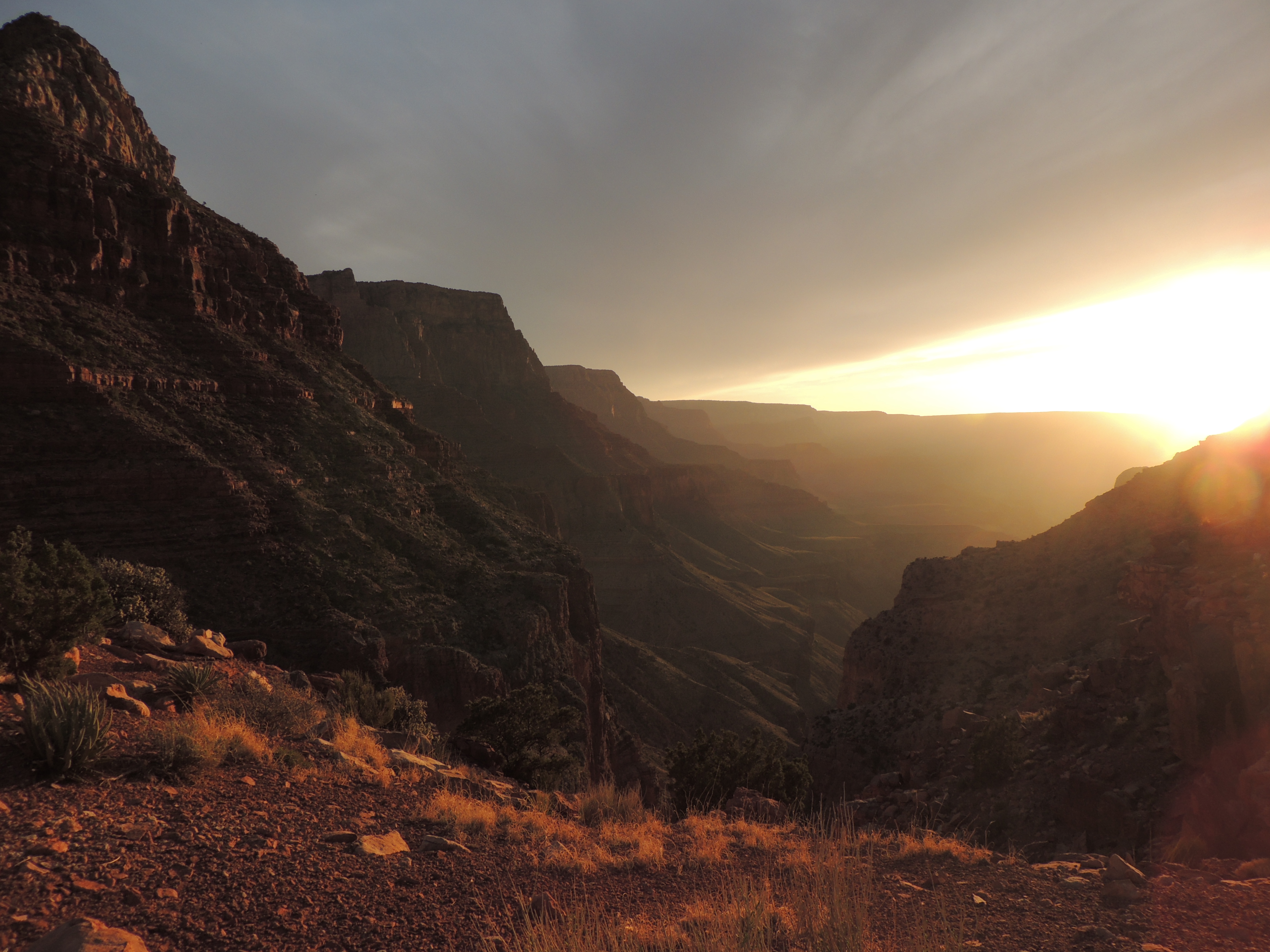 I’m watching the sun sink behind the canyon walls, three miles and a couple of thousand vertical feet below the rim of the Grand Canyon. It’s a beautiful April evening, with a welcome breeze that keeps the desert flies away.