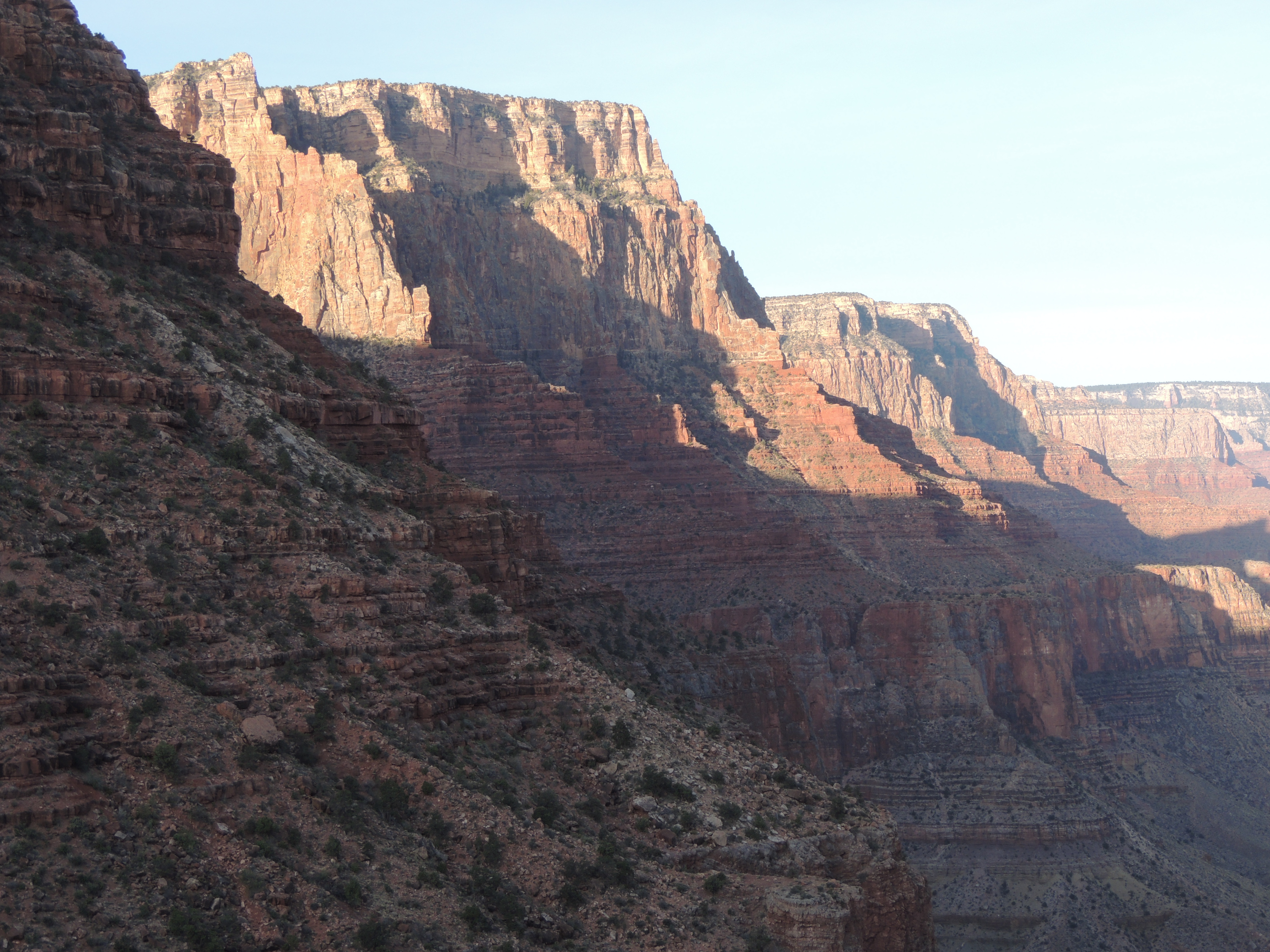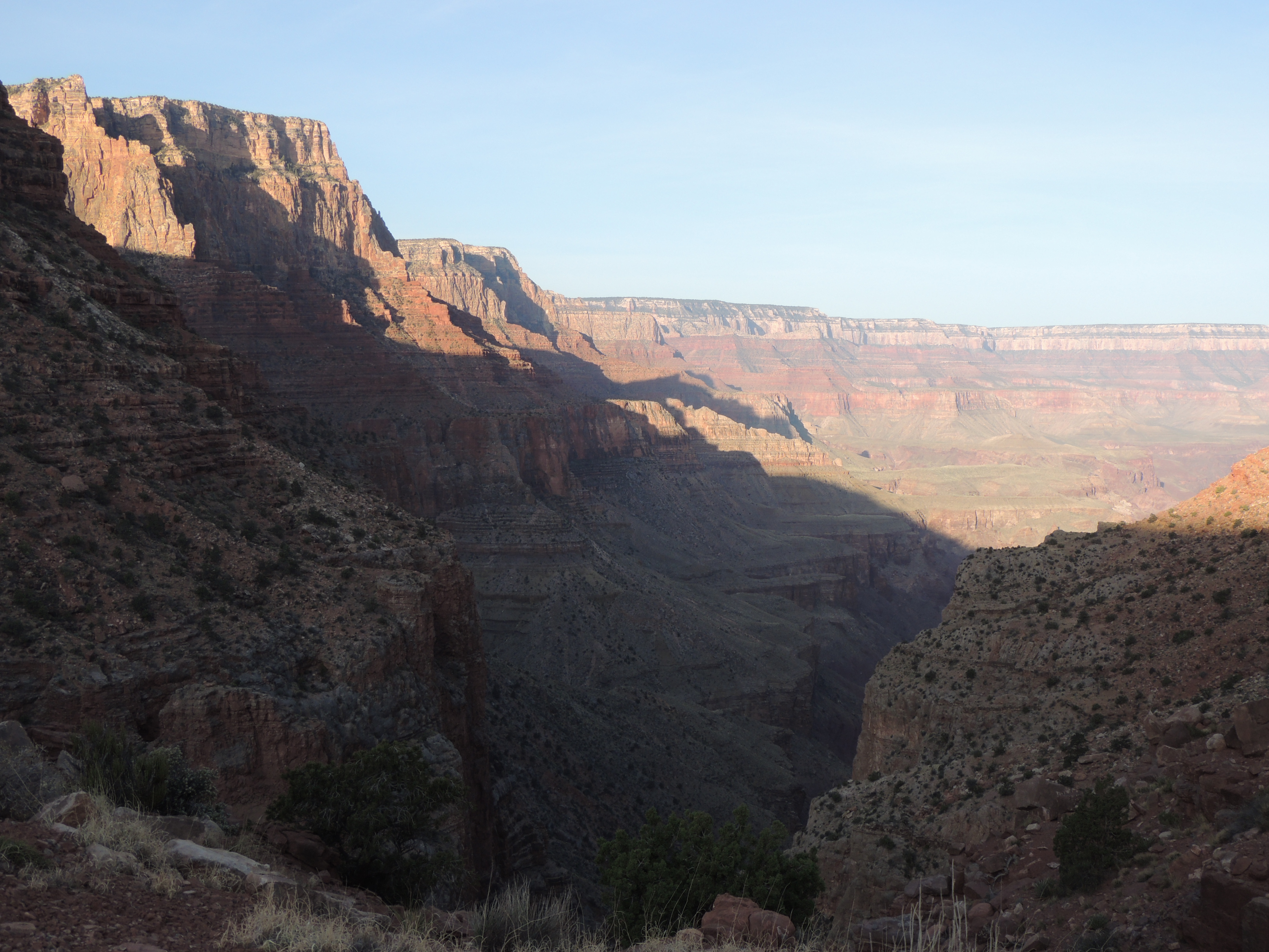 The day before we’d stopped at the backcountry office to see if we could get a backpacking permit. It was after noon by the time we arrived, so we weren’t counting on getting one, but we were in luck: there was a permit available for the Tanner Trail. Now, we haven’t hiked much at all in the Grand Canyon, and I’d only read a little about the different trails. The backcountry ranger looked us over pretty hard before she brought up this hike, and questioned us in what I thought was surprising detail about our hiking and backpacking experience. She said that the Tanner was a “really rough” trail, with no water, and that normally she’d only give a permit to folks with experience on the easier trails in the canyon. But apparently we passed whatever test she was giving us, because we got the permit. (I think it helped that we could obviously read a topo map, and we had the Trails Illustrated map that she was using, and that we immediately made it clear that we had no intention of hiking to the bottom and up on a one-night trip. And that I wasn’t standing before her in a tank top and flip flops and shorty-shorts!)