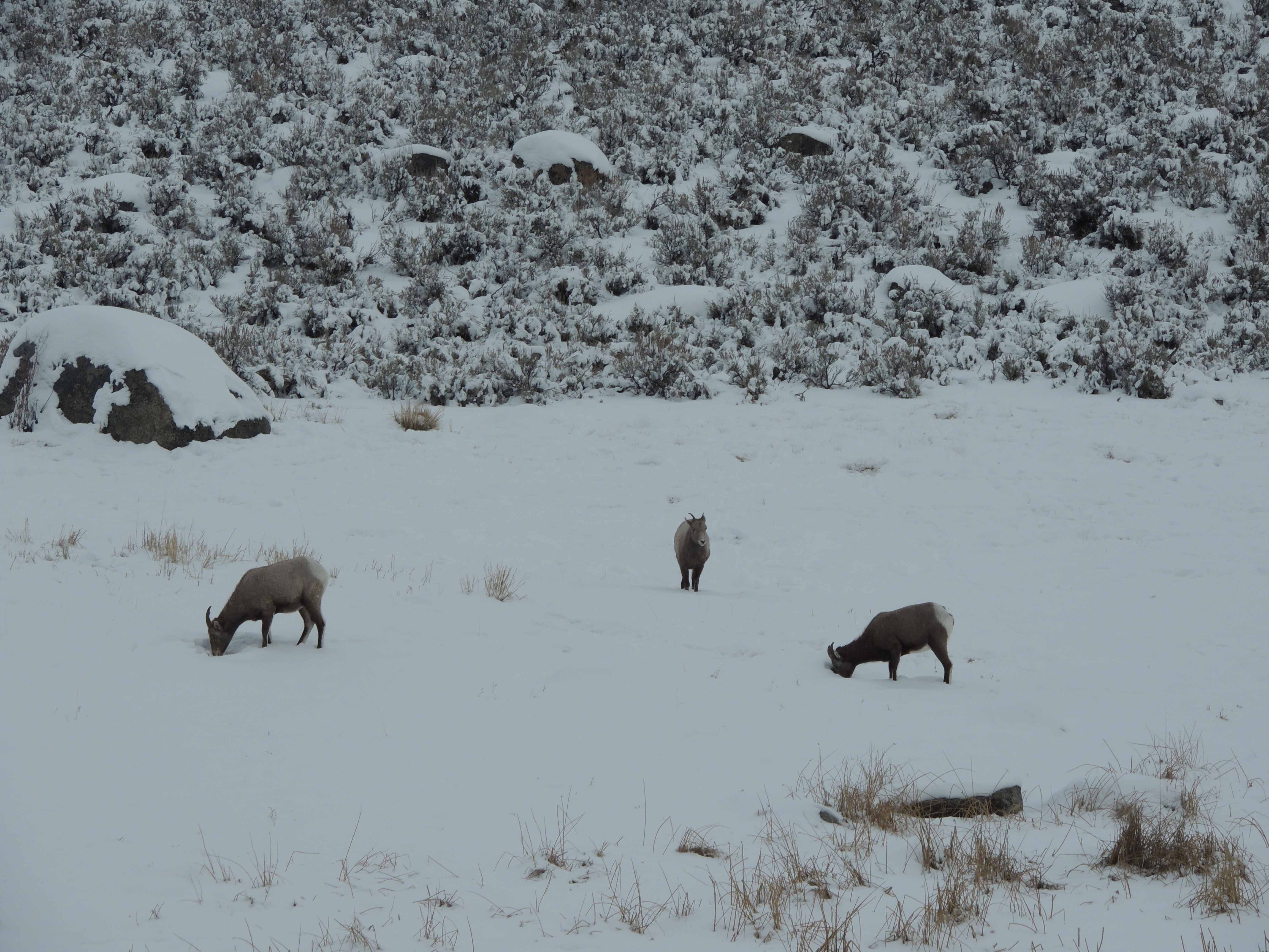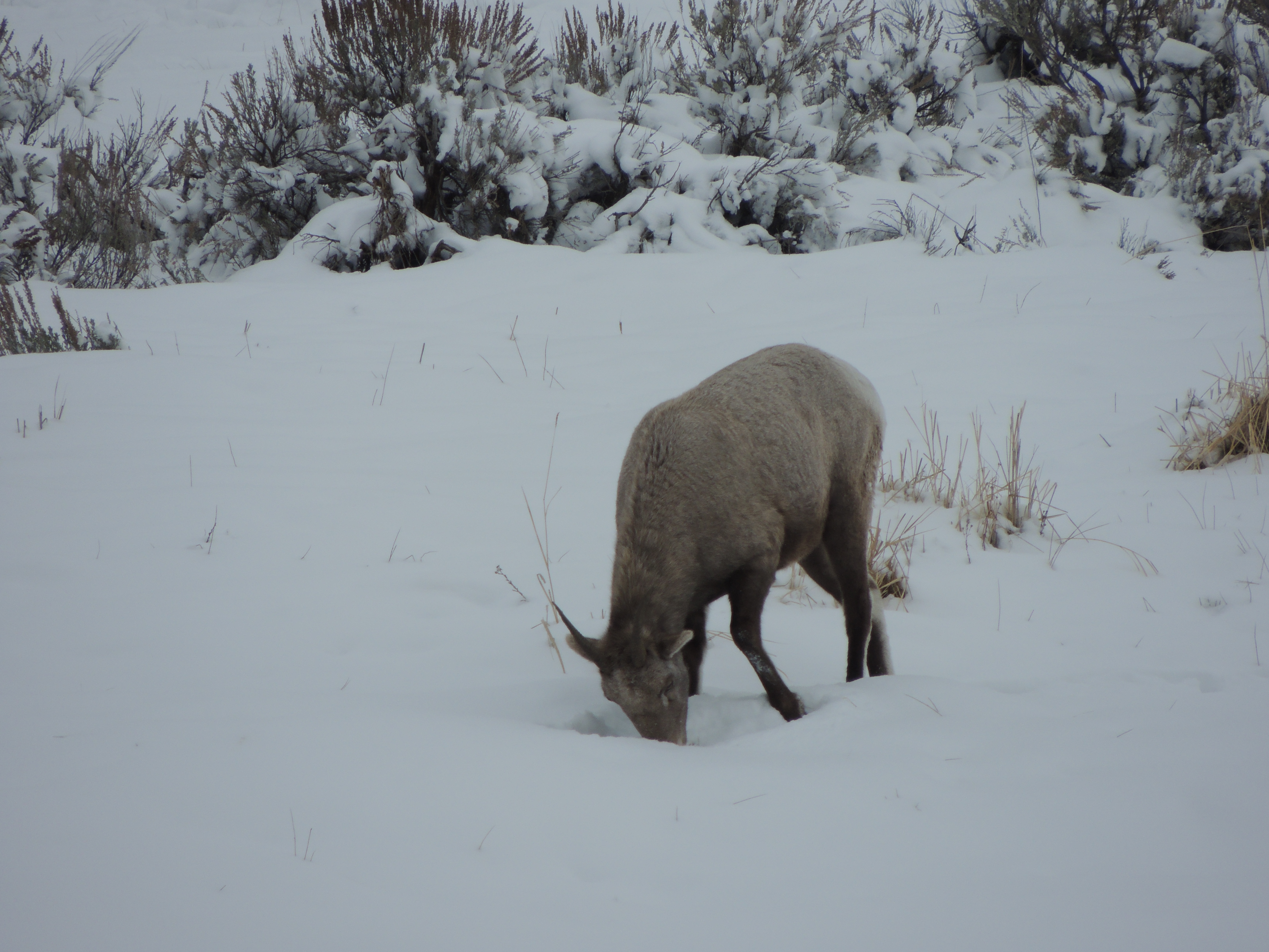 Bighorn Sheep paw through the snow, looking for a remnant of last summer’s grass,