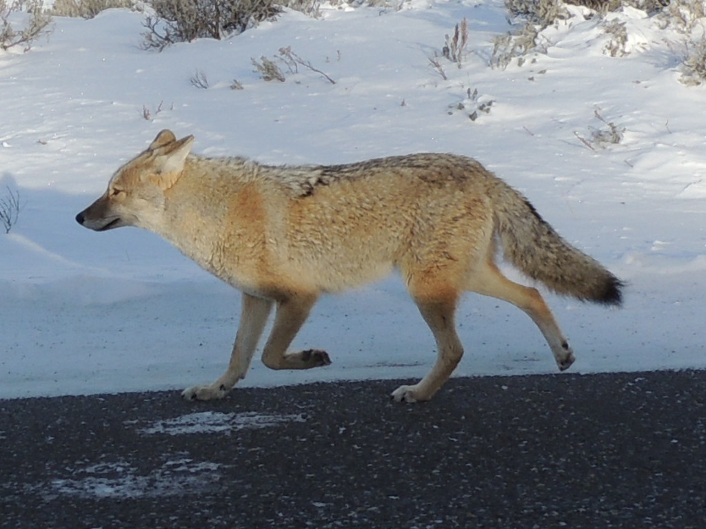 and a coyote strides down the road…on a mission to find some lunch.