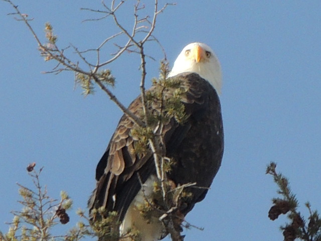 The eagle in the pictures above was busy, busy, busy.  It’s mate, however, was more concerned with keeping an eye on me from another tree: