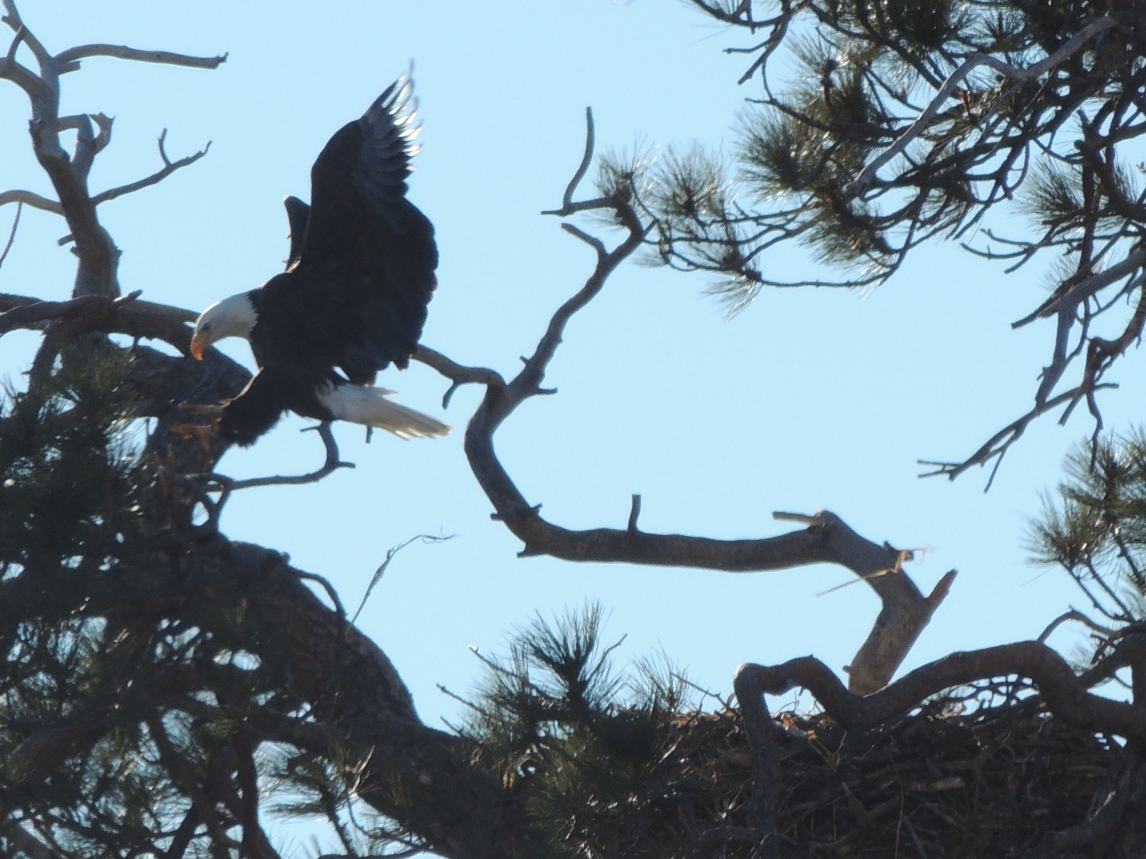The nest sits high up in a gnarled and twisted Ponderosa pine.    It’s a brilliant spot for an eagle:  not far from the Missouri River, but also near fields that are bursting with ground squirrels in the spring and summer.    Last weekend the eagles were busy checking it out and bringing new sticks to shore up the walls.