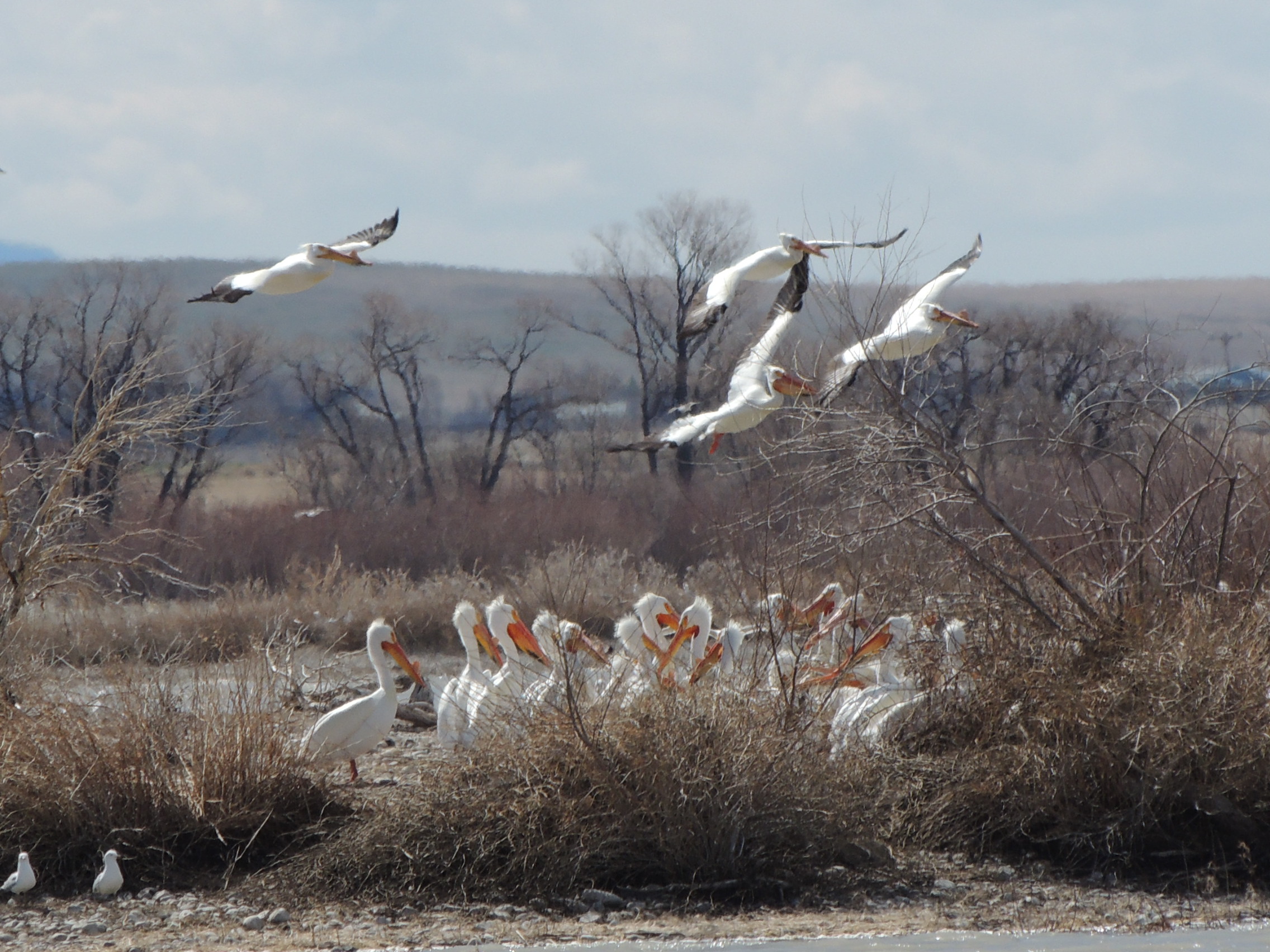 We watched the front heading our way,  but it hung over the mountains long enough for us to find a calm little cove that was sheltering hundreds of white pelicans.