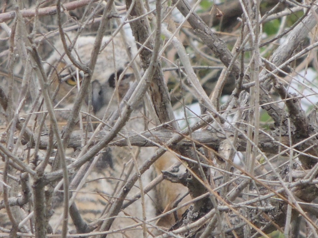 Then there are the critters that insist on hanging out behind all sorts of branches. Owls are pretty good at it,