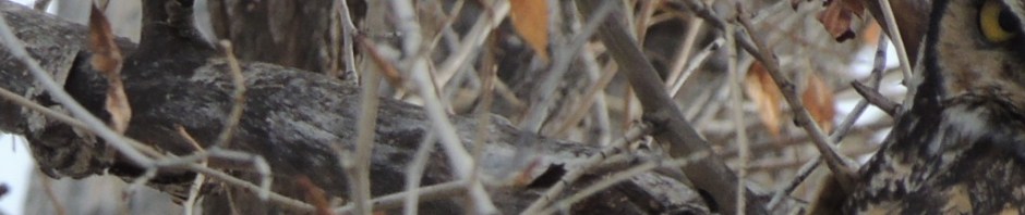 Yesterday’s task was to try and find a Great Horned Owl that we knew was hanging around some old cottonwoods not too far from our house. We tramped around the slushy woods, looking for that distinctive owl silhouette on one of the bare branches. After 45 minutes of searching, I was just about to give up when Bill stopped and pointed: “There he is!”