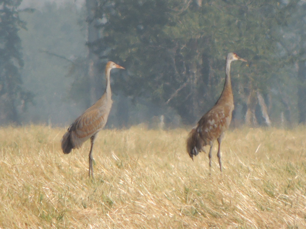 The combination of a smoky morning and a long-distance shot gives these Sandhill Cranes the mysterious, other-worldly quality they deserve, don’t you think?