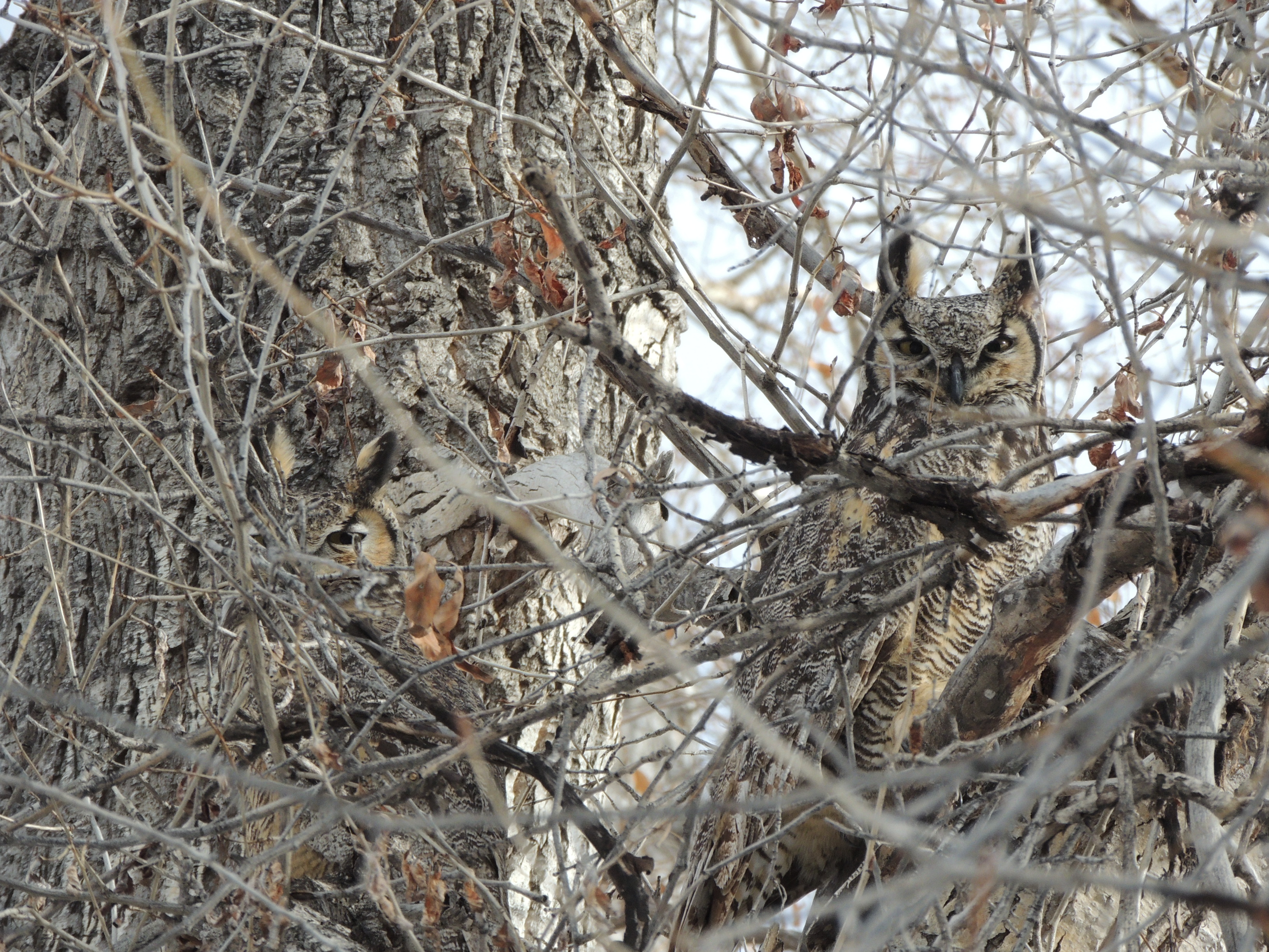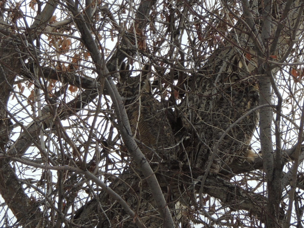 The owls are intent on each other…at least the male is intent on the female. She seems more interested in looking for dinner.
