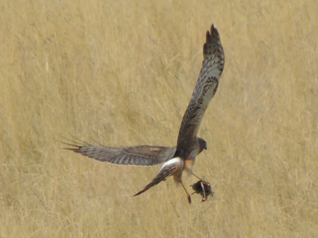And when the owls decide it’s time for a rest, the Northern Harrier gives up his mating dance rehearsal and starts hunting for dinner. It doesn’t take him long, either. If I were a female Harrier, I do believe this example of hunting prowess would be more impressive than his silly roller coaster acrobatics.