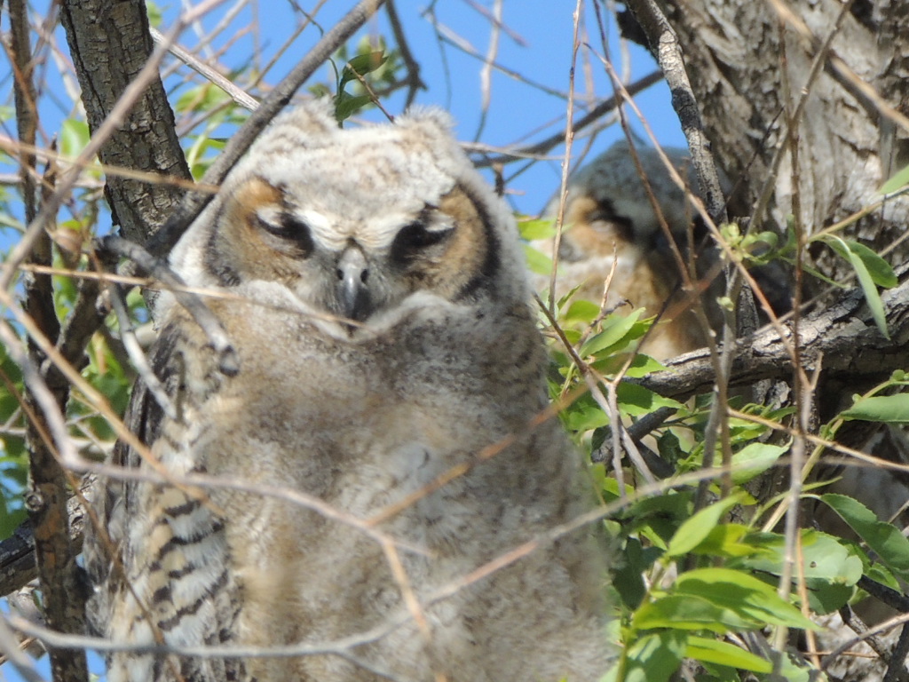 When I arrived at the Hauser nest on April 21, things looked different. The eagle was in the nest, but it seemed to be sitting higher than before. Eventually the second eagle returned, and they both were focused on something in the nest: an eaglet! I could just see his little head poking up over the side of the nest. Too small for a photo, but he was there. When I next returned to the nest – about 10 days later – the eaglet was big enough to see clearly: